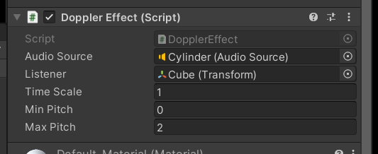 To demonstrate this effect, I’ve created a scene with two objects: a cube and a cylinder. The cube will be the listener, the cylinder is the emitter and it has an engine sound. The cylinder will move back and forward relative to the listener then stop and repeat the movement. A script controls the movement of the object and its speed.