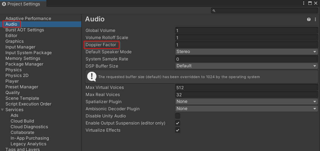 A simple implementation is possible through Unity’s built-in audio system. There is a global control called Doppler factor which is used to set how audible the Doppler effect is. - you can find it in the project settings under “Audio”. 0 will disable the effect, 1 will make it audible for fast moving objects (see documentation). The effect will be more prominent as the value increases, whereas values below 1 will diminish the perceived effect (SINCLAIR, 2020).