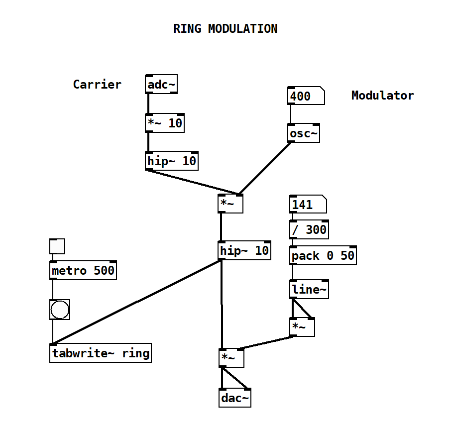 You can use a microphone input to get that robot voice I initially told you about - your voice will be the carrier in this case. Let’s add an [adc~] and amplify the signal [*~ 10] and then multiply it by our modulator.